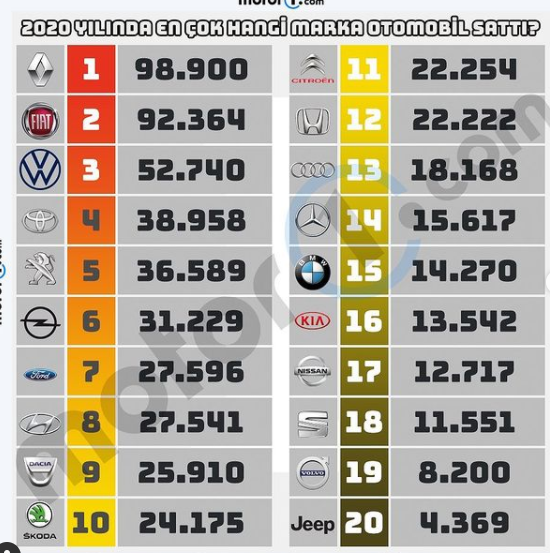 istatistik yarisi turkiye de en cok satan araba markalari 2004 2020