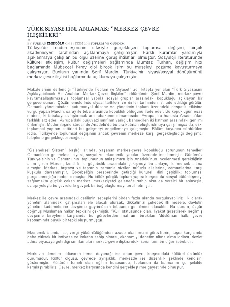 turk siyasetini anlamak merkez cevre