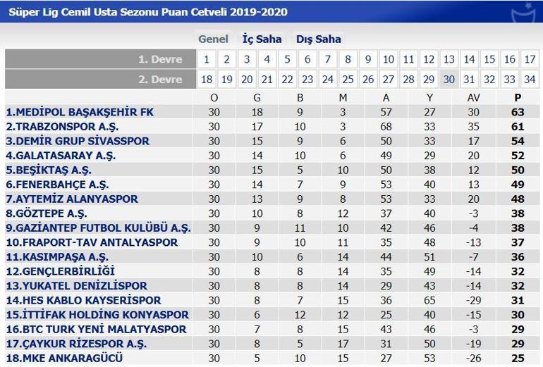 son 20 sezonun puan durumu